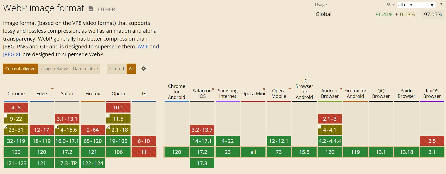 しかし、2018年のMicrosoft Edgeの対応を皮切りに、2020年にはApple Safari(iOS)が対応し主要ブラウザの対応がほぼ完了したことで、ようやくWebPの課題が解消されました。