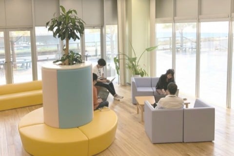 弊社1Fのリラックスルームを利用します。受付を行いますので、1Fの正面入口よりお入りください。