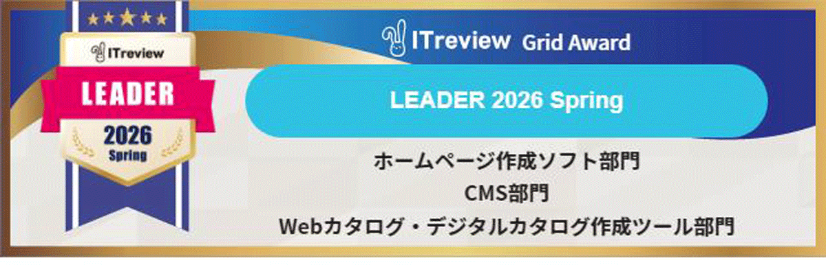 このたび、弊社主力商品「おりこうブログ」が、アイティクラウド社が主催する「ITreview Grid Award 2026 Spring」において「Leader」を受賞いたしましたのでお知らせいたします。(「ホームページ作成ソフト」部門27期連続、「CMS」部門26期連続、「Webカタログ・デジタルカタログ作成ツール」部門8期連続受賞となります。)