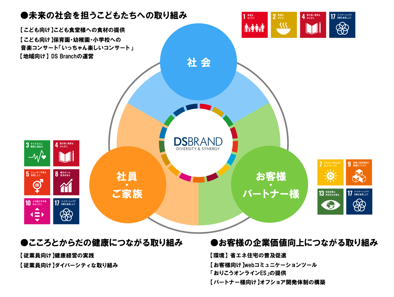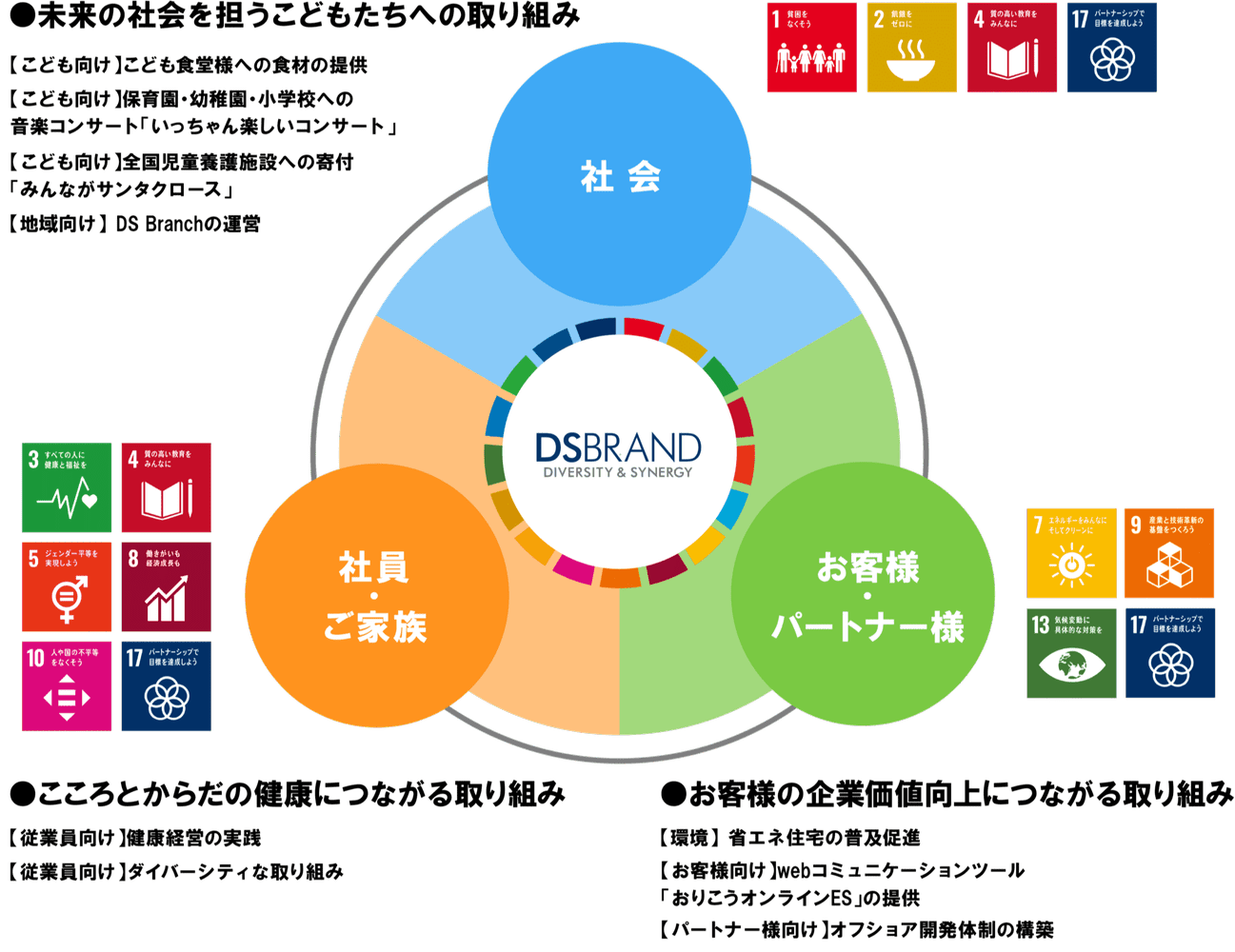 株式会社ディーエスブランドは、「持続的成長と社会貢献」を企業理念に、当社の持続的な成長を通じ、お客様、パートナー様、地域社会、社員とそのご家族のお役に立てるように企業活動に取り組んでおります。